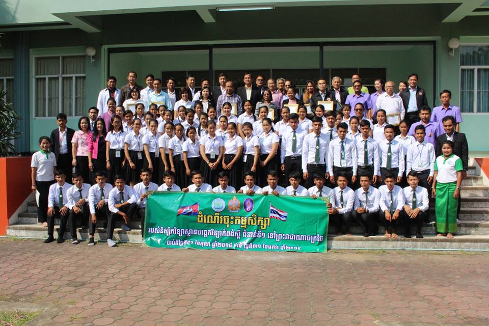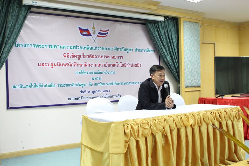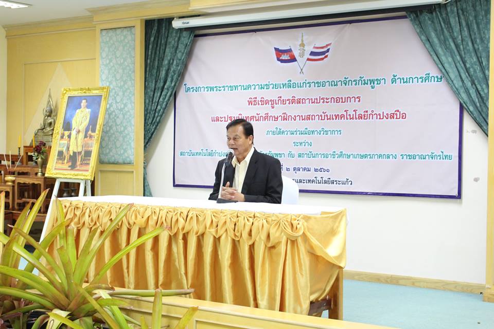 วันที่ 2 ตุลาคม 2561 นายวีระศักดิ์ วงษ์สมบัติ นายกสภาสถาบันการอาชีวศึกษาเกษตรภาคกลาง นายสิทธิศักดิ์ รัตนพาณิชย์ ผู้อำนวยการสถาบันการอาชีวศึกษาเกษตรภาคกลาง เข้าร่วมเปิดงานในโครงการพระราชทานความช่วยเหลือแก่ราชอาณาจักรกัมพูชา ด้านการศึกษา ในพิธีเชิดชูเกียรติสถานประกอบการและปฐมนิเทศนักศึกษาฝึกงานสถาบันเทคโนโลยีกัมปงสปือภายใต้ความร่วมมือทางวิชาการระหว่าง สถาบันเทคโนโลยีกำปงสปือ ราชอาณาจักรกัมพูชากับสถาบันการอาชีวศึกษาเกษตรภาคกลาง ในวันที่ 2 ตุลาคม 2561 ณ วิทยาลัยเกษตรและเทคโนโลยีสระแก้ว