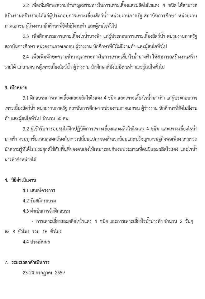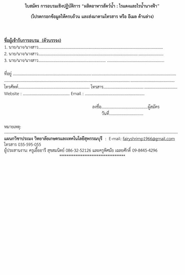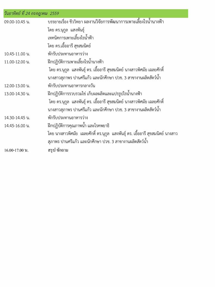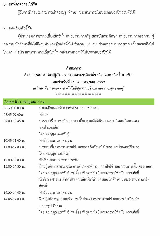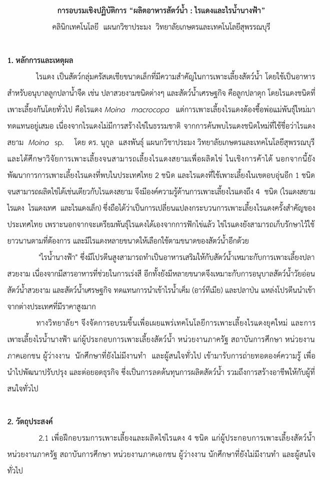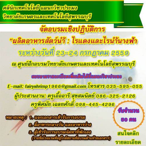 จัดอบรมเชิงปฏิบัติการ “ผลิตอาหารสัตว์น้ำ : ไรแดงและไรน้ำนางฟ้า Published: 10 September 2017 Written by Super User Category: ประกาศ ระหว่างวันที่ 23-24 กรกฎาคม 2559 สนใจสอบถามเพิ่มเติม : https://www.facebook.com/informationofspcat/photos/?tab=album&album_id=1018489638247151