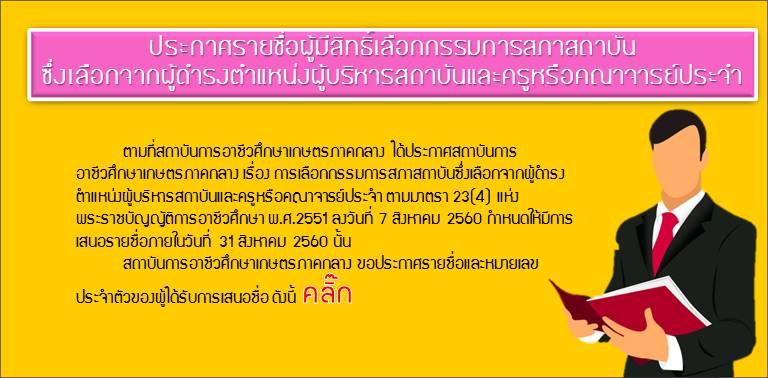 ประกาศรายชื่อสรรหากรรมการสภา Published: 05 September 2017 Written by Super User Category: ประกาศ ประกาศรายชื่อผู้มีสิทธิเข้ารับการคัดเลือกกรรมการสภาสถาบันการอาชีวศึกษาเกษตรภาคกลาง โดยคัดเลือกจากผู้ดำรงตำแหน่งผู้บริหารสถาบันและครูหรือคณะอาจารย์ ดาวน์โหลดเอกสาร ประกาศ