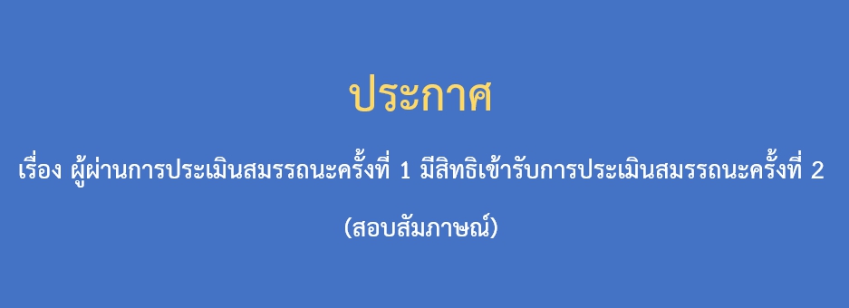 ประกาศ เรื่อง ผู้ผ่านการประเมินสมรรถนะครั้งที่ 1 มีสิทธิเข้ารับการประเมินสมรรถนะครั้งที่ 2 (การสอบสัมภาษณ์) Published: 24 March 2021 Written by jane Category: ประกาศ ประกาศ เรื่อง ผู้ผ่านการประเมินสมรรถนะครั้งที่ 1 มีสิทธิเข้ารับการประเมินสมรรถนะครั้งที่ 2 (การสอบสัมภาษณ์) ประกาศ