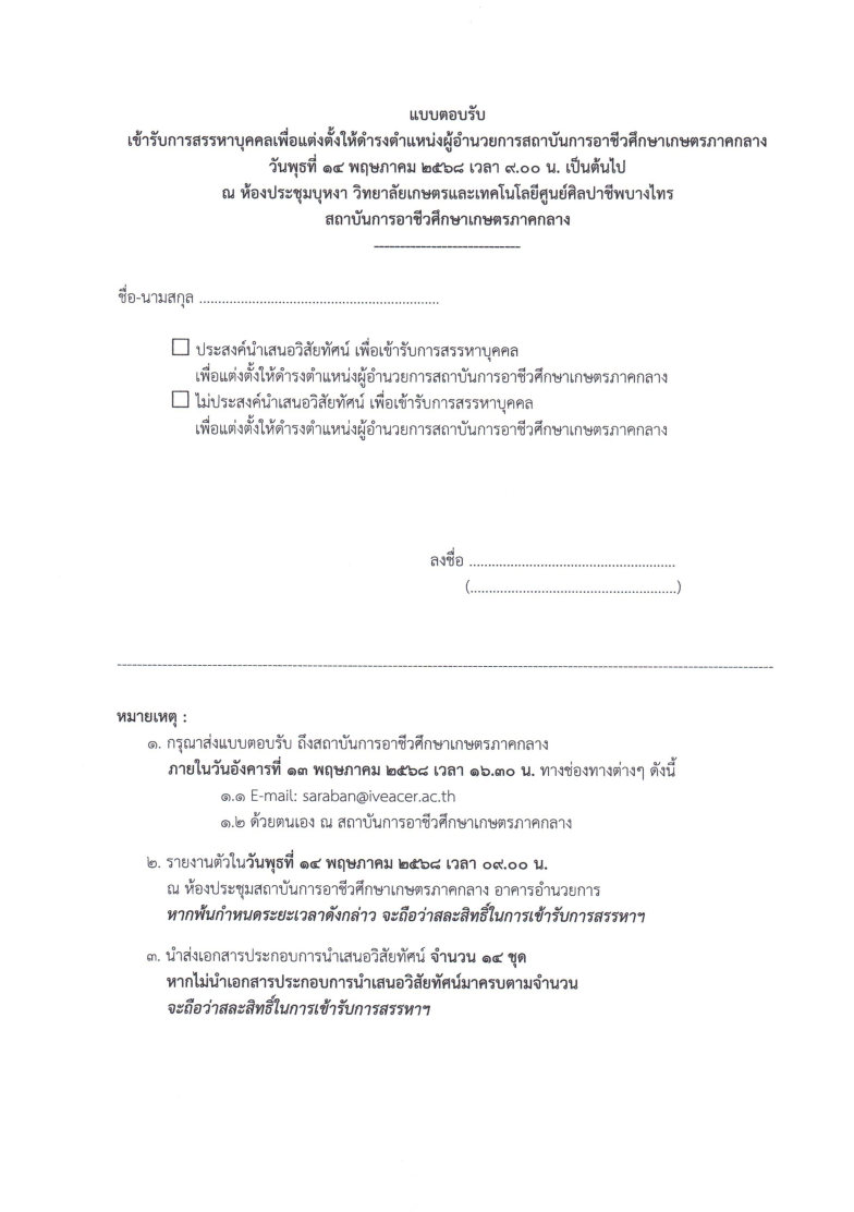ประกาศคณะกรรมการสรรหาบุคคลเพื่อแต่งตั้งให้ดำรงตำแหน่งผู้อำนวยการสถาบันการอาชีวศึกษาเกษตรภาคกลาง เรื่อง ประกาศรายชื่อผู้มีคุณสมบัติเหมาะสมที่จะเข้ารับการสรรหาบุคคลเพื่อแต่งตั้งให้ดำรงตำแหน่งผู้อำนวยการสถาบันการอาชีวศึกษาเกษตรภาคกลาง Published: 07 May 2025 Written by Tuang Category: ประกาศ ประกาศคณะกรรมการสรรหาบุคคลเพื่อแต่งตั้งให้ดำรงตำแหน่งผู้อำนวยการสถาบันการอาชีวศึกษาเกษตรภาคกลาง เรื่อง ประกาศรายชื่อผู้มีคุณสมบัติเหมาะสมที่จะเข้ารับการสรรหาบุคคลเพื่อแต่งตั้งให้ดำรงตำแหน่งผู้อำนวยการสถาบันการอาชีวศึกษาเกษตรภาคกลาง ดาวน์โหลดเอกสาร ประกาศ