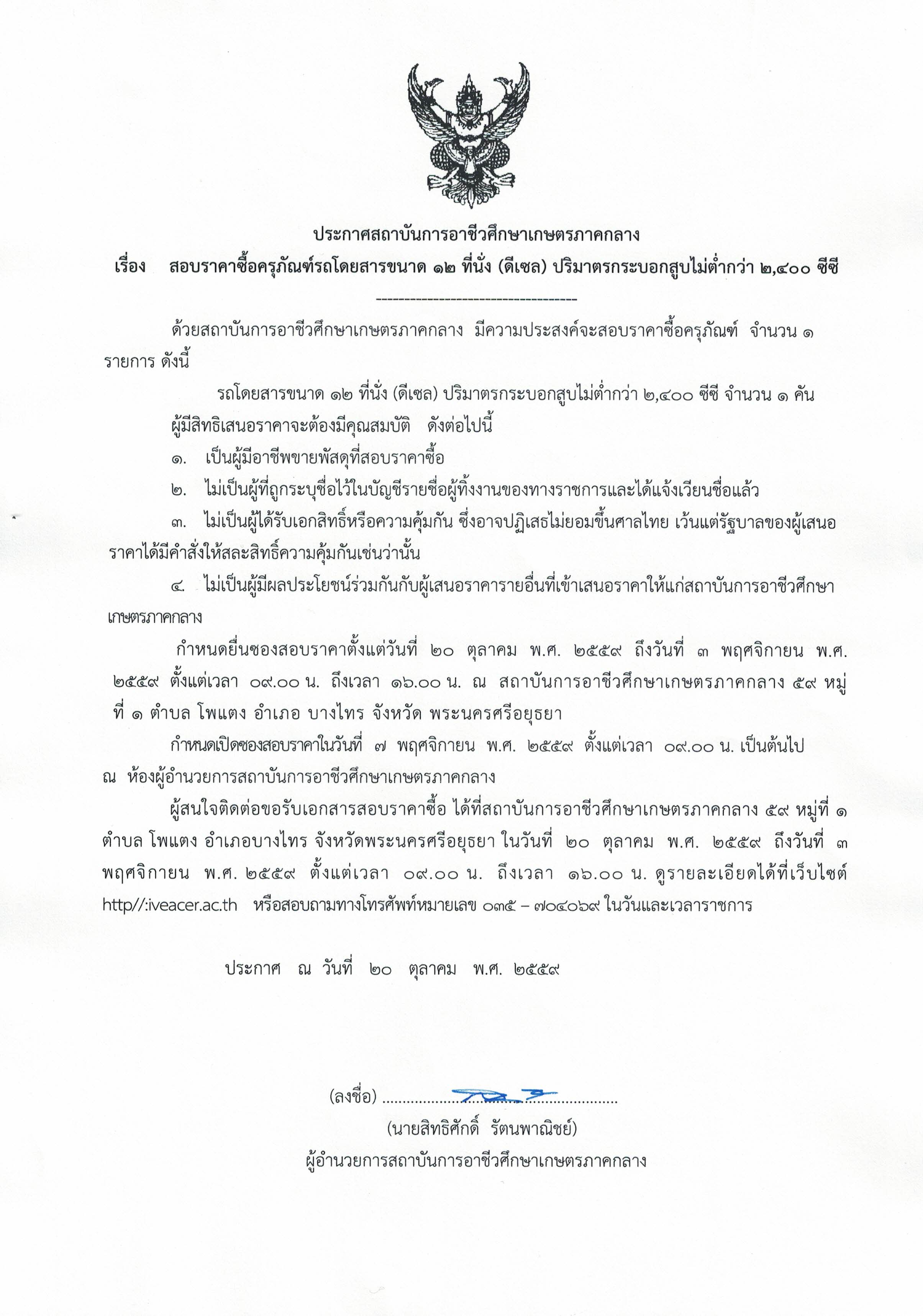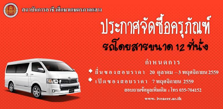 จัดซื้อครุภัณฑ์รถโดยสารขนาด 12 ที่นั่ง (ดีเซล) ปริมาตรกระบอกสูบไม่ต่ำกว่า 2400 ซีซี(ขยายเวลา) Published: 09 September 2017 Written by Super User Category: ประกาศ จัดซื้อครุภัณฑ์รถโดยสารขนาด 12 ที่นั่ง (ดีเซล) ปริมาตรกระบอกสูบไม่ต่ำกว่า 2400 ซีซี