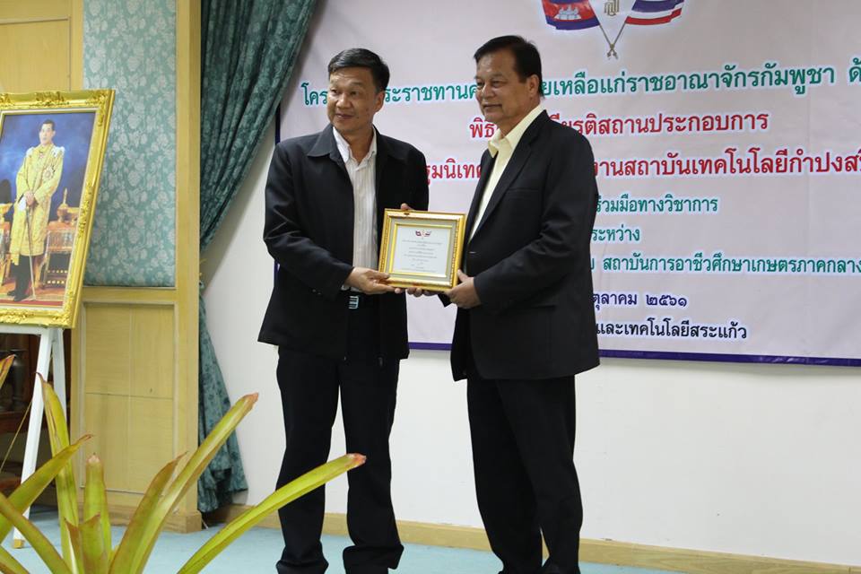 วันที่ 2 ตุลาคม 2561 นายวีระศักดิ์ วงษ์สมบัติ นายกสภาสถาบันการอาชีวศึกษาเกษตรภาคกลาง นายสิทธิศักดิ์ รัตนพาณิชย์ ผู้อำนวยการสถาบันการอาชีวศึกษาเกษตรภาคกลาง เข้าร่วมเปิดงานในโครงการพระราชทานความช่วยเหลือแก่ราชอาณาจักรกัมพูชา ด้านการศึกษา ในพิธีเชิดชูเกียรติสถานประกอบการและปฐมนิเทศนักศึกษาฝึกงานสถาบันเทคโนโลยีกัมปงสปือภายใต้ความร่วมมือทางวิชาการระหว่าง สถาบันเทคโนโลยีกำปงสปือ ราชอาณาจักรกัมพูชากับสถาบันการอาชีวศึกษาเกษตรภาคกลาง ในวันที่ 2 ตุลาคม 2561 ณ วิทยาลัยเกษตรและเทคโนโลยีสระแก้ว