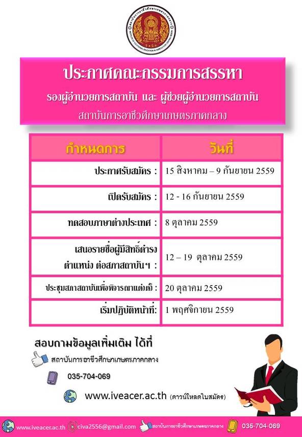 ประกาศรับสมัครสรรหารองผู้อำนวยการและผู้ช่วยผู้อำนวยการ สถาบันการอาชีวศึกษาเกษตรภาคกลาง Published: 10 September 2017 Written by Super User Category: ประกาศ ประกาศรับสมัครสรรหารองผู้อำนวยการและผู้ช่วยผู้อำนวยการ สถาบันการอาชีวศึกษาเกษตรภาคกลาง ประกาศ