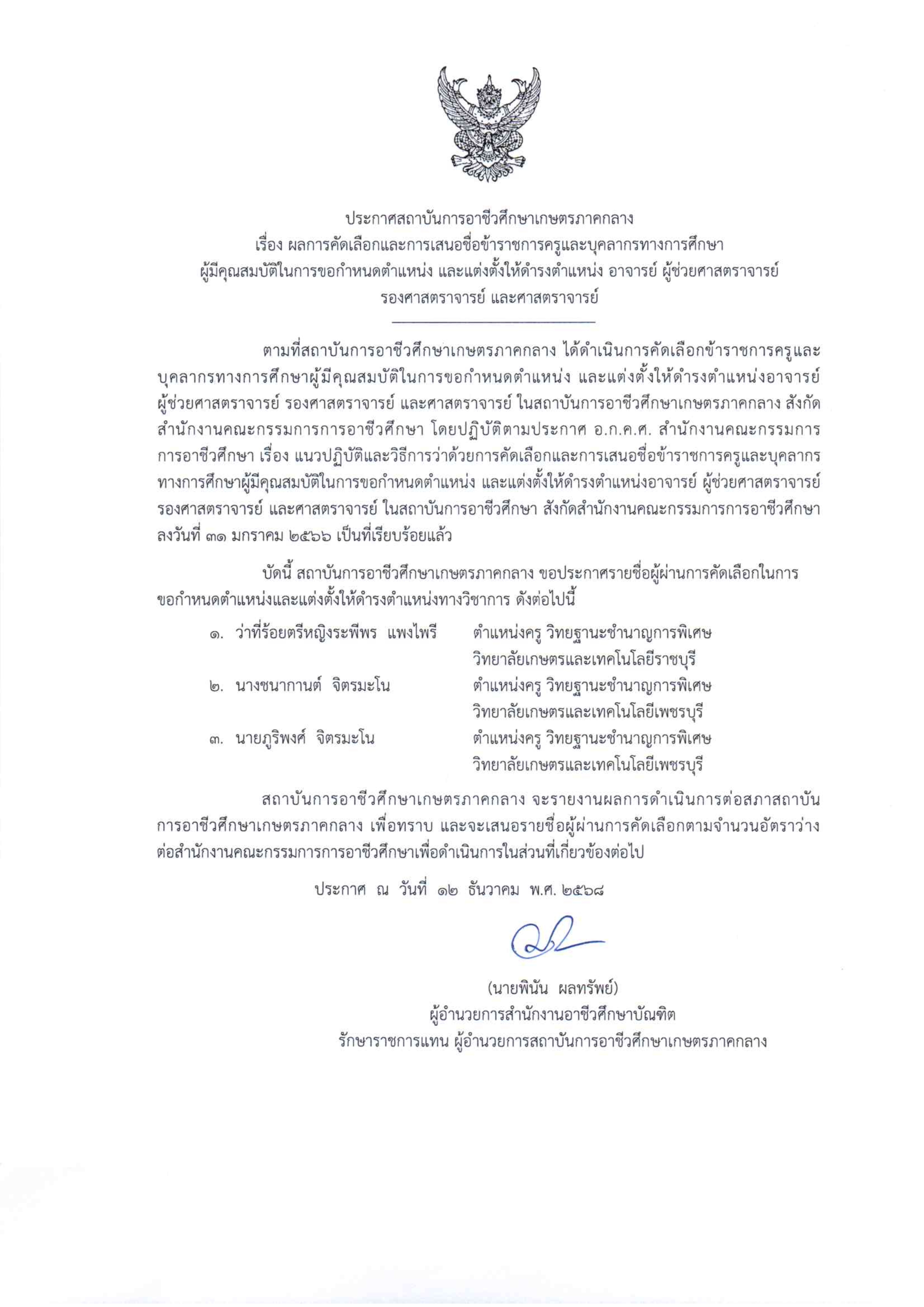 บัดนี้ สถาบันการอาชีวศึกษาเกษตรภาคกลาง ขอประกาศรายชื่อผู้ผ่านการคัดเลือกในการขอกำหนดตำแหน่งและแต่งตั้งให้ดำรงตำแหน่งทางวิชาการ ดังต่อไปนี้